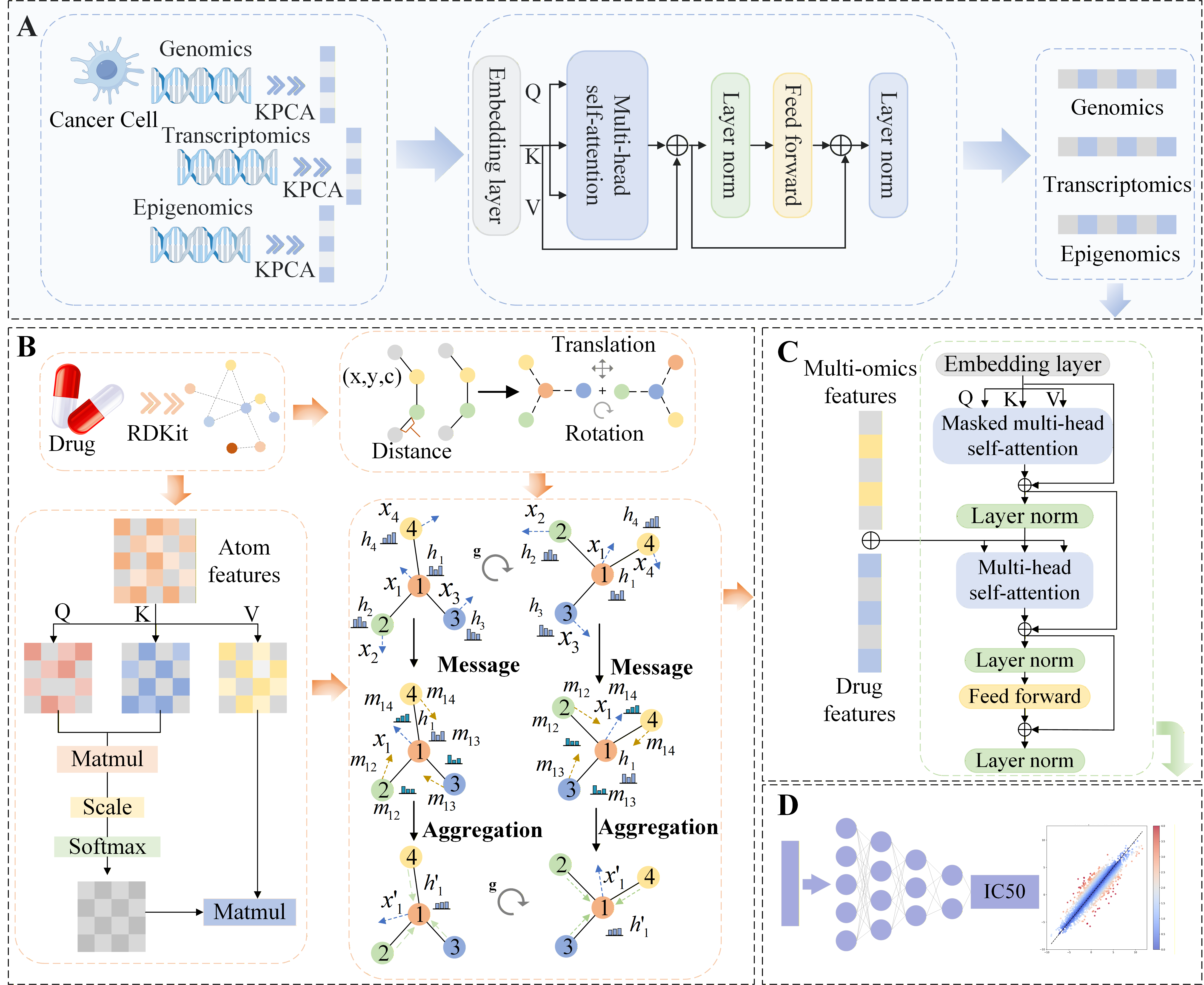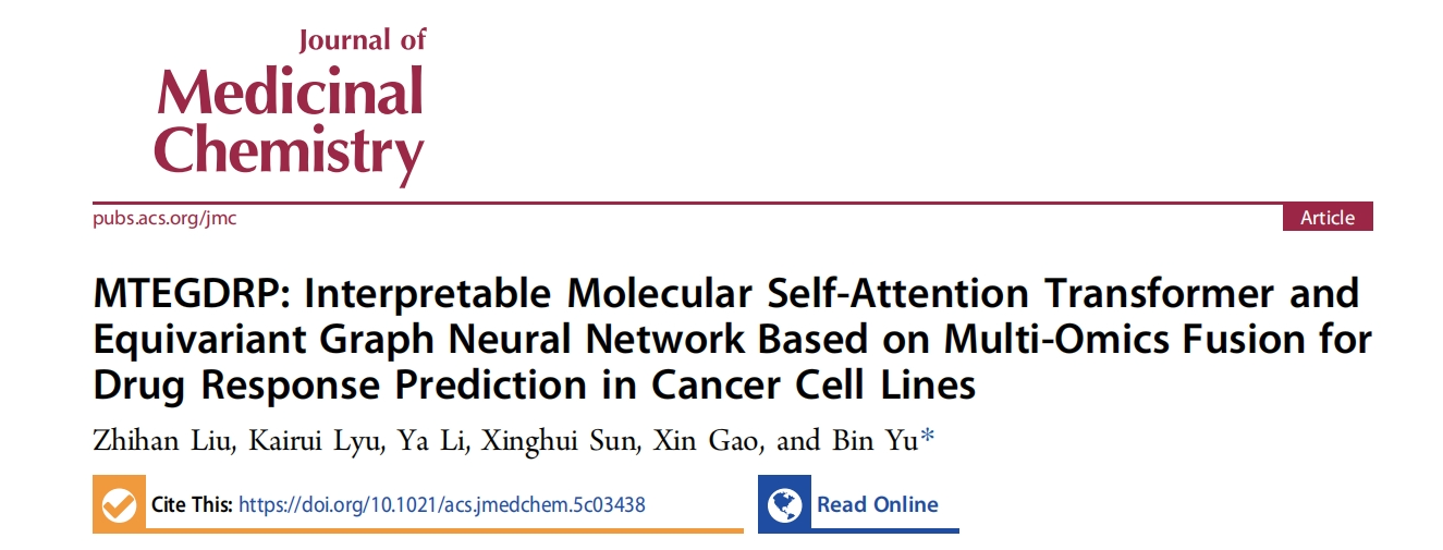 近日,数据科学学院于彬教授团队在人工智能驱动药物发现研究领域取得重要进展,相关成果以“MTEGDRP: Interpretable Molecular Self-Attention Transformer and Equivariant Graph Neural Network Based on Multi-Omics Fusion for Drug Response Prediction in Cancer Cell Lines”为题发表在药物化学领域顶级期刊Journal of Medicinal Chemistry (JMC)。于彬教授为论文的唯一通讯作者,2023级研究生刘志涵为第一作者,青岛科技大学为第一完成单位。
