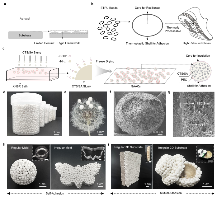 气凝胶,被誉为“改变世界的十大神奇材料”之一,以其超低密度和卓越隔热性能而闻名。然而,传统气凝胶表面多孔、骨架刚硬,导致其难以与基材形成牢固界面,极大限制了其在功能性系统中的集成应用。青岛科技大学张建明教授团队受膨胀热塑性聚氨酯(ETPU)珠粒核–壳结构启发,将二氧化硅气凝胶与羧基丁腈橡胶有机结合,开发了具有自粘性的可热加工成型的气凝胶胶囊 (SAACs)。该 SAACs可在80°C以下的温和温度下进行热加工,自粘形成三维组装体,最高自粘强度达55 kPa,并能自适应不规则形状及粘附于多种基材表面。同时,由于二氧化硅气凝胶纳米孔的保留,SAACs表现出低密度(57-96 mg·cm⁻³)、分级多孔结构特征,从而赋予其低热导率(30-39 mW·m⁻¹·K⁻¹)以及优异的阻燃特性(极限氧指数约36.5%)。该研究首次将ETPU核–壳结构理念引入气凝胶设计,构建了兼具热加工性、自粘附性、轻质隔热与阻燃性能的SAACs平台,为气凝胶在建筑节能、高温防护与复杂构件隔热等场景的工程化应用提供了新的思路。
