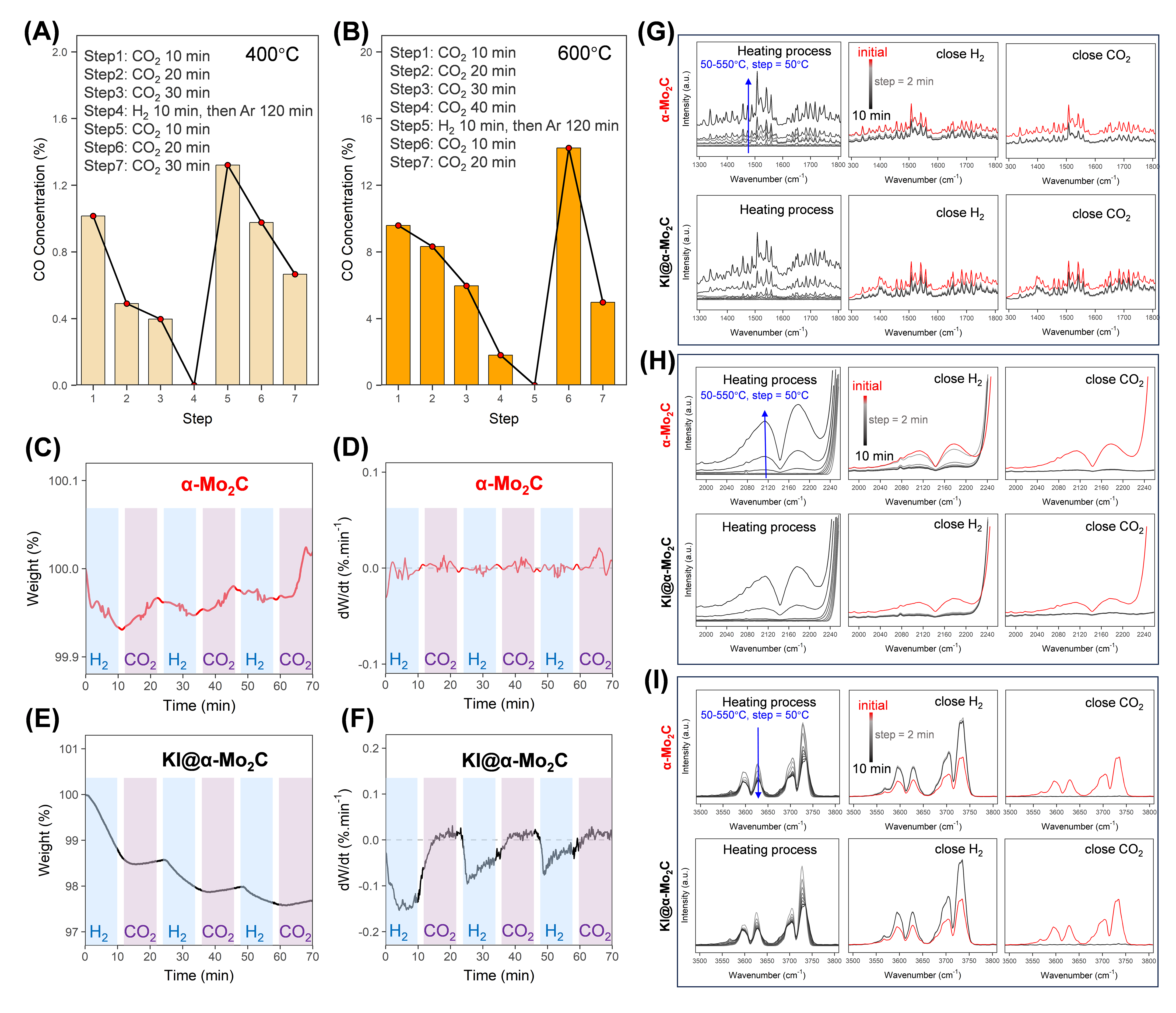 通过SEM, XRD, XPS, BET, in situ DRIFTS, in situ TGA,球差电镜,同步辐射以及δ18O同位素含量分析等表征方法证明,掺杂的I元素有效地增强了α-Mo2C活化H2的能力,从而提高其CO2转化率。而K元素的掺杂则稳定了更多表面非晶态氧(作为“氧银行”)在α-Mo2C上,有效抑制了甲烷化副反应,实现催化剂在400°C和4 bar条件下接近热力学平衡的CO收率。