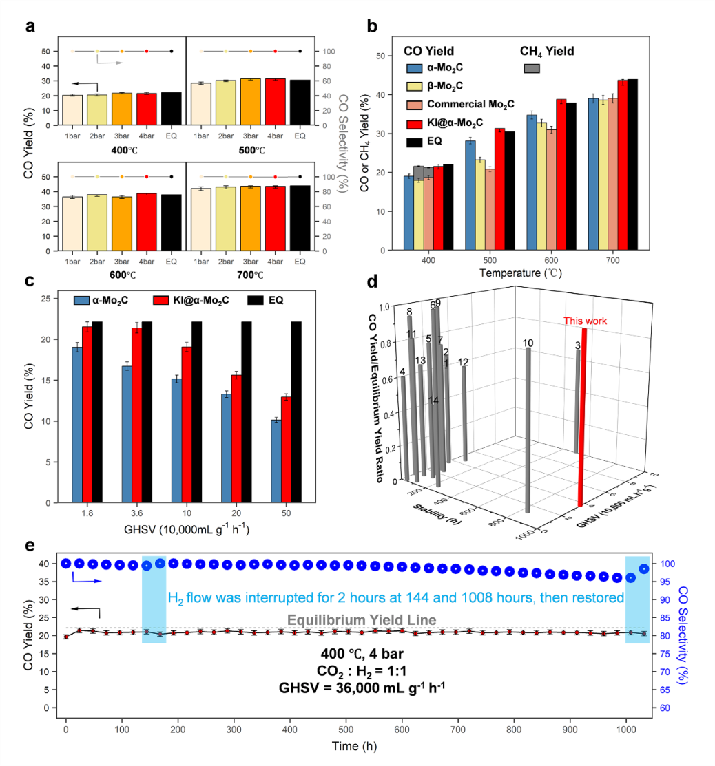 课题组首次将KI掺杂进α-Mo2C合成了KI@α-Mo2C,实现了非贵金属催化剂在400-700°C和1-4 bar反应条件范围内接近热力学平衡的CO收率和100%的CO选择性。特别是在气时空速为36,000 mL g-1h-1的情况下,KI@α-Mo2C在400°C和4 bar条件下,实现了超过1000小时接近0.95 CO平衡收率的超高稳定性。