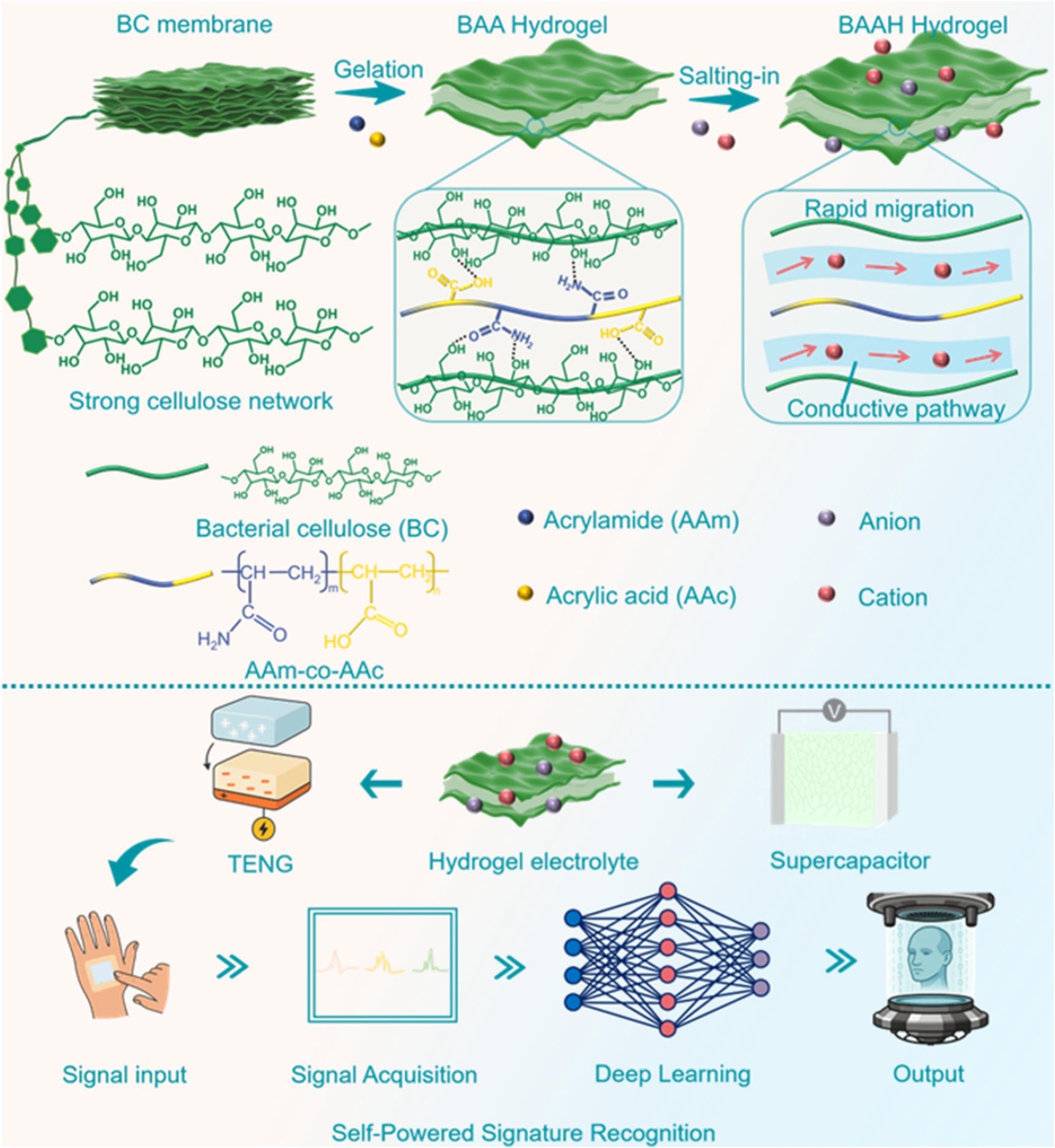 团队针对柔性电子器件中水凝胶电解质机械强度与离子导电性难以兼顾的矛盾,提出了一种Hofmeister效应驱动的多尺度网络调控策略。利用细菌纤维素(BC)纳米纤维构建增强骨架,并通过丙烯酰胺-丙烯酸(AAm-AAc)共聚形成柔性聚电解质网络,同时利用特定离子调控氢键结构和水合环境,实现水凝胶内部离子传输通道的构筑。