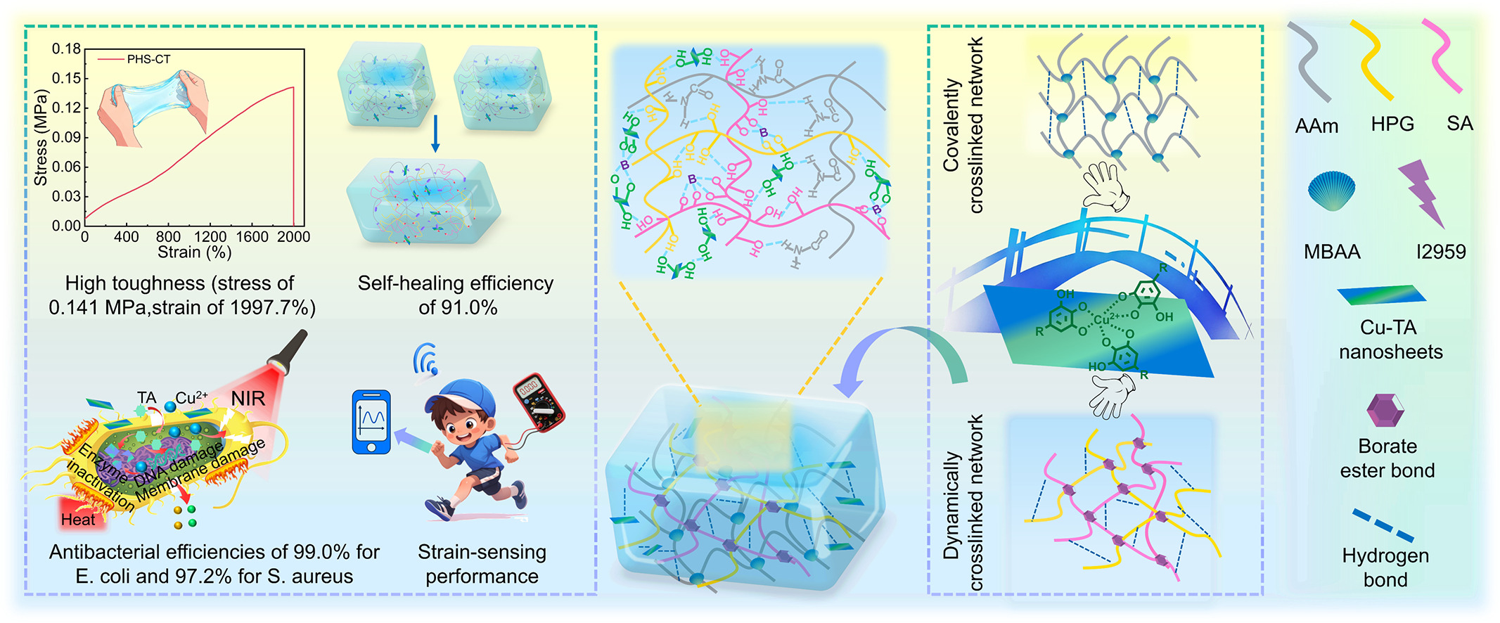 针对传统水凝胶难以兼顾高韧性、自愈合、高效抗菌与灵敏传感的难题,研究团队提出了一种“纳米桥(nano-bridge)”设计策略,成功构筑了由聚丙烯酰胺共价网络与硼酸酯动态交联网络构成的双网络水凝胶体系。在该水凝胶中,引入的铜-单宁酸(Cu-TA)纳米片同时实现了水凝胶的结构增强与功能赋予。